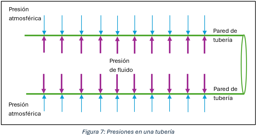 La siguiente representación nos muestra cómo actúa la presión atmosférica y la presión del fluido sobre las paredes de una tubería. Esta diferencia de valores de las presiones es lo que indica un manómetro.