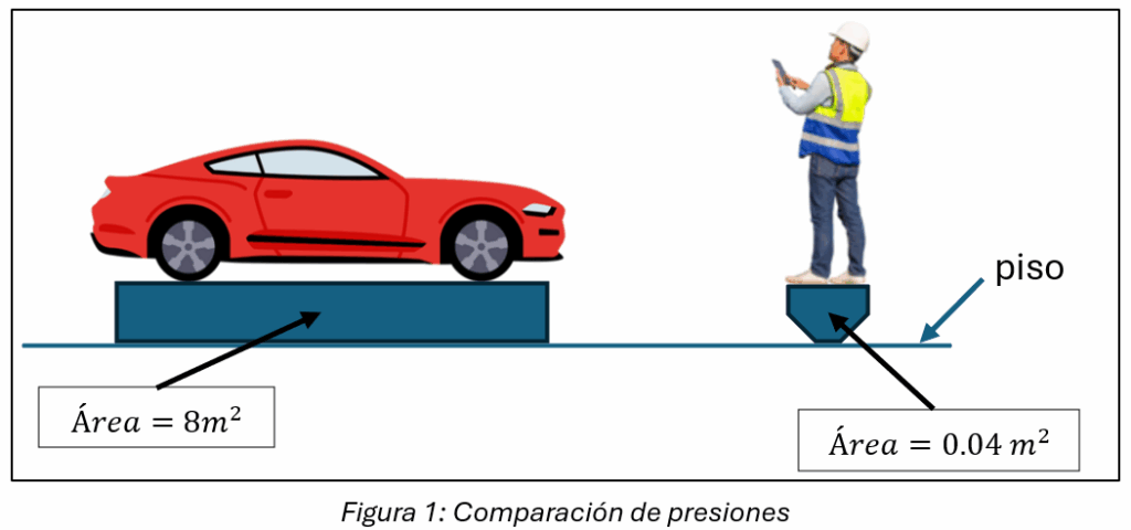 Explicación: La persona ejerce una presión muy alta porque su peso se concentra en un área diminuta. El carro ejerce 5 veces menos presión que la persona, porque su peso se distribuye sobre una superficie mucho mayor.